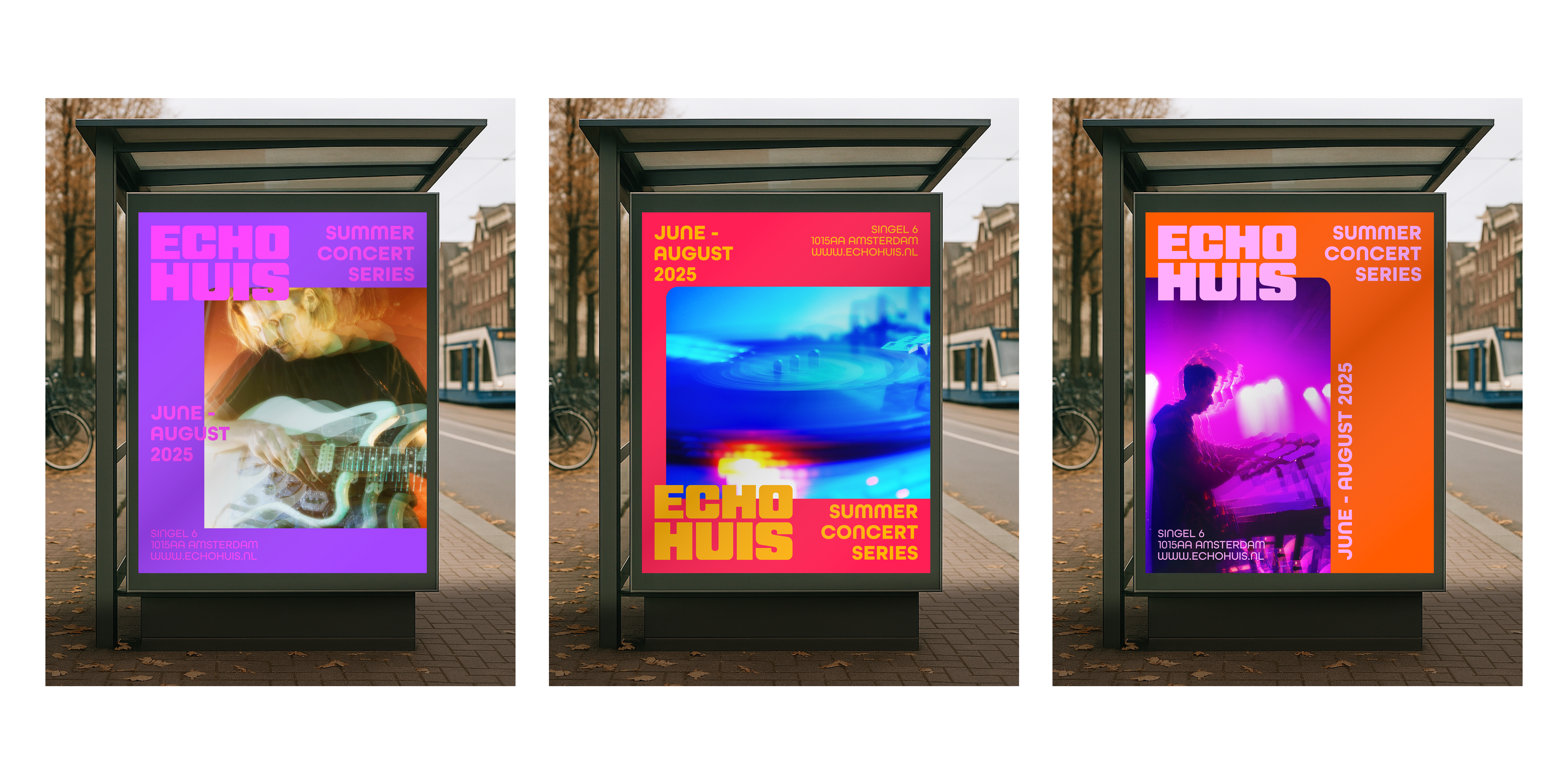 For a personal project, I decided to design and create a set of three cohesive posters for a conceptual Dutch music venue, Echohuis. Located in the heart of Amsterdam, Echohuis is a pop music venue, nightclub, and arts & culture hub that hosts a wide variety of musical performances each year. Their mission is to inspire both tourists and locals to support and get involved in the arts & music scene. While creating these posters, I was inspired by the work of Dutch design studios such as Thonik and Experimental Jetset, and iconic Dutch music venues such as Melkweg and Paradiso. I created these pieces using Adobe Photoshop and Illustrator.