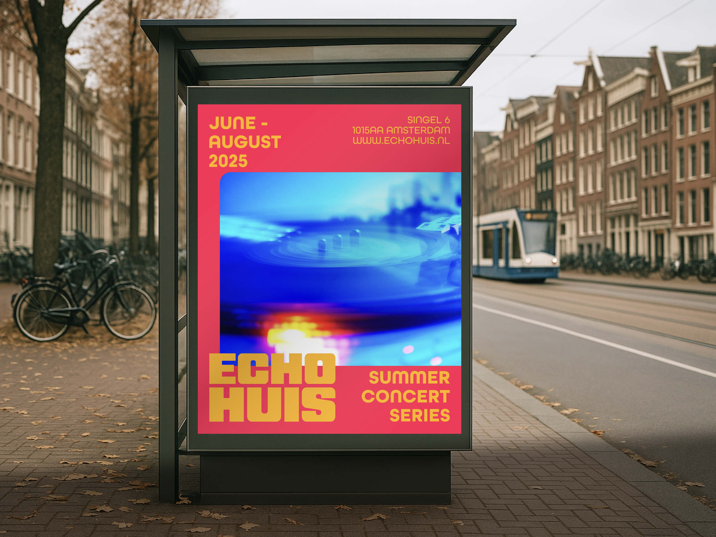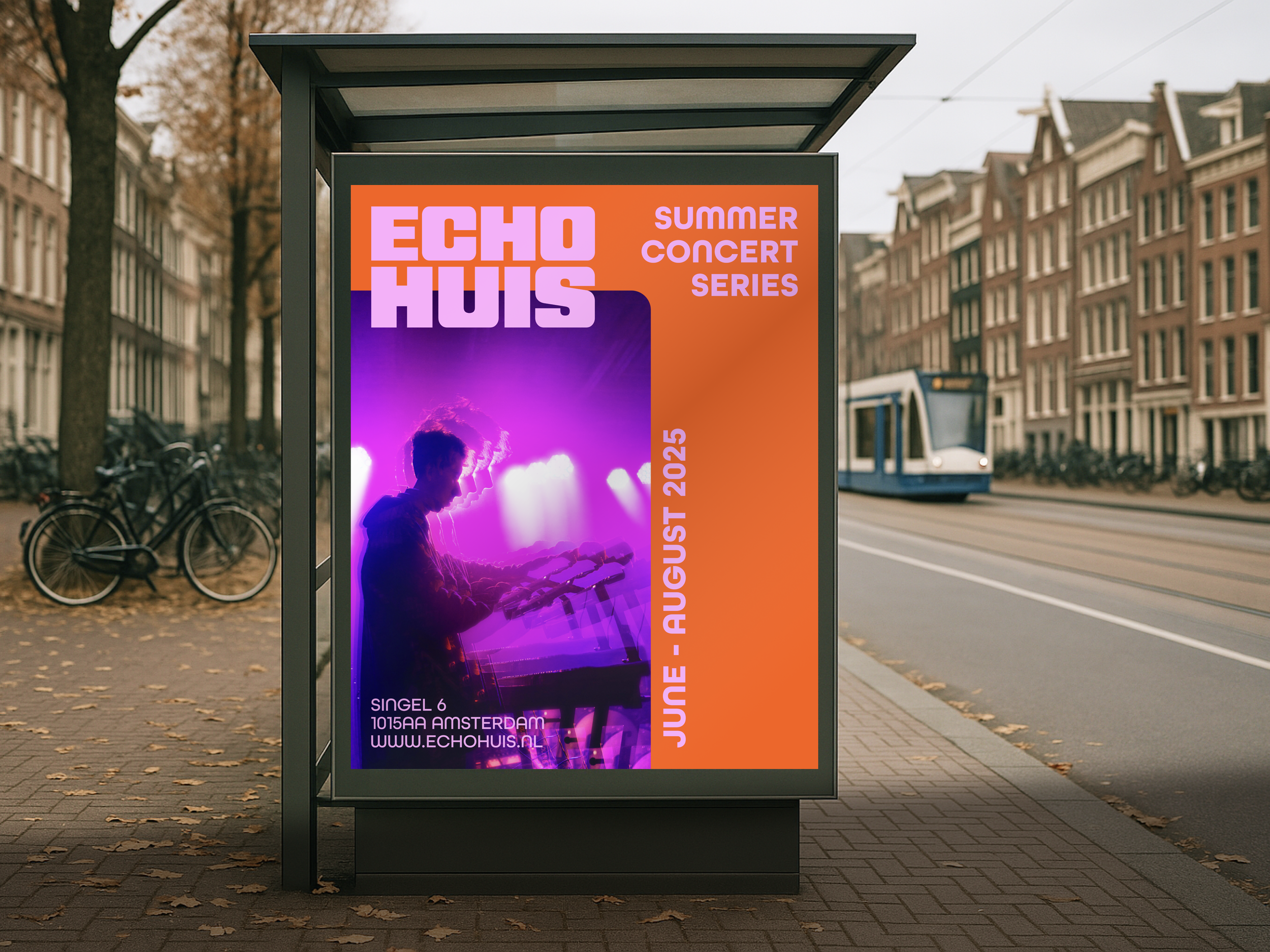For a personal project, I decided to design and create a set of three cohesive posters for a conceptual Dutch music venue, Echohuis. Located in the heart of Amsterdam, Echohuis is a pop music venue, nightclub, and arts & culture hub that hosts a wide variety of musical performances each year. Their mission is to inspire both tourists and locals to support and get involved in the arts & music scene. While creating these posters, I was inspired by the work of Dutch design studios such as Thonik and Experimental Jetset, and iconic Dutch music venues such as Melkweg and Paradiso. I created these pieces using Adobe Photoshop and Illustrator.