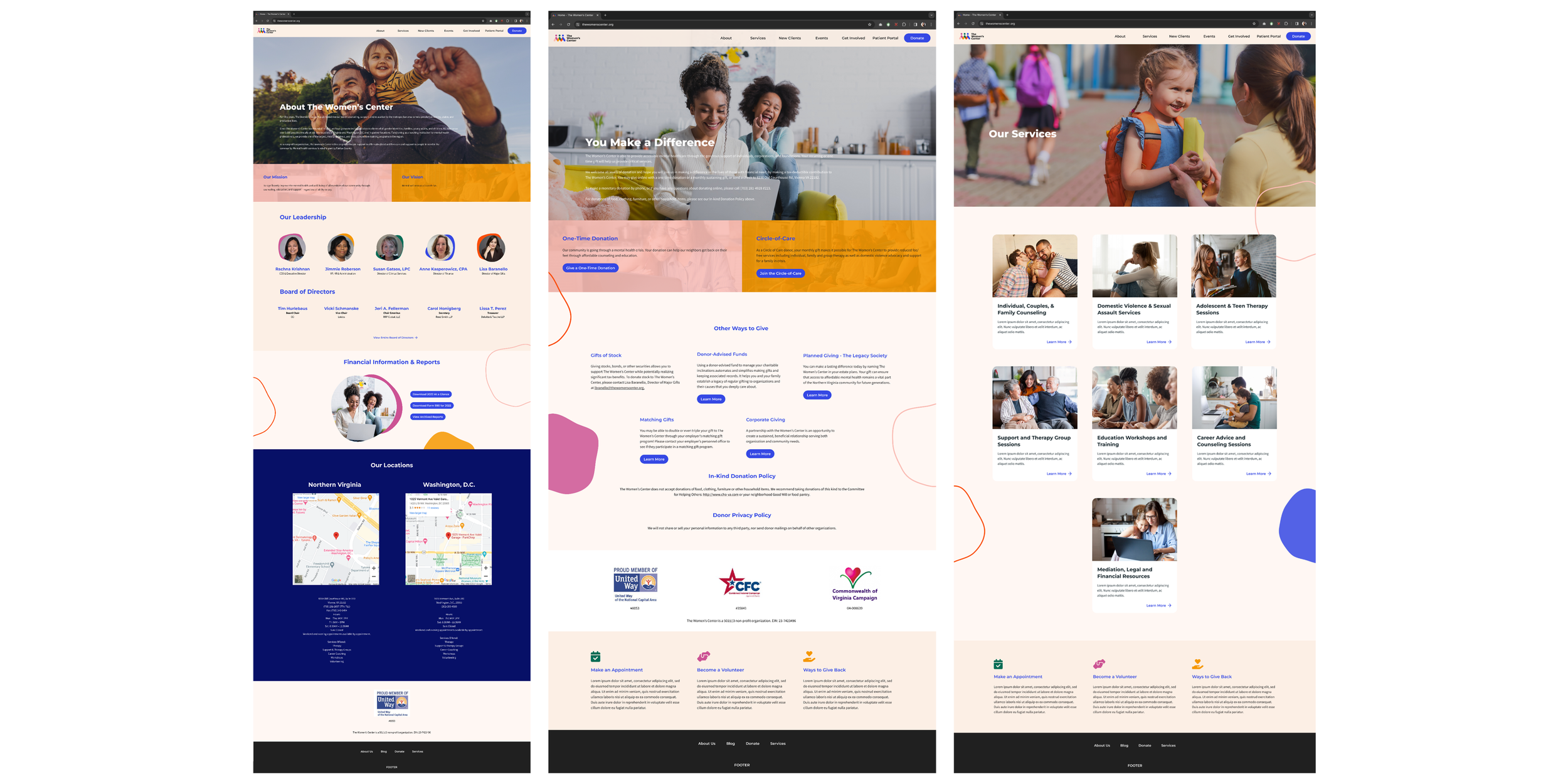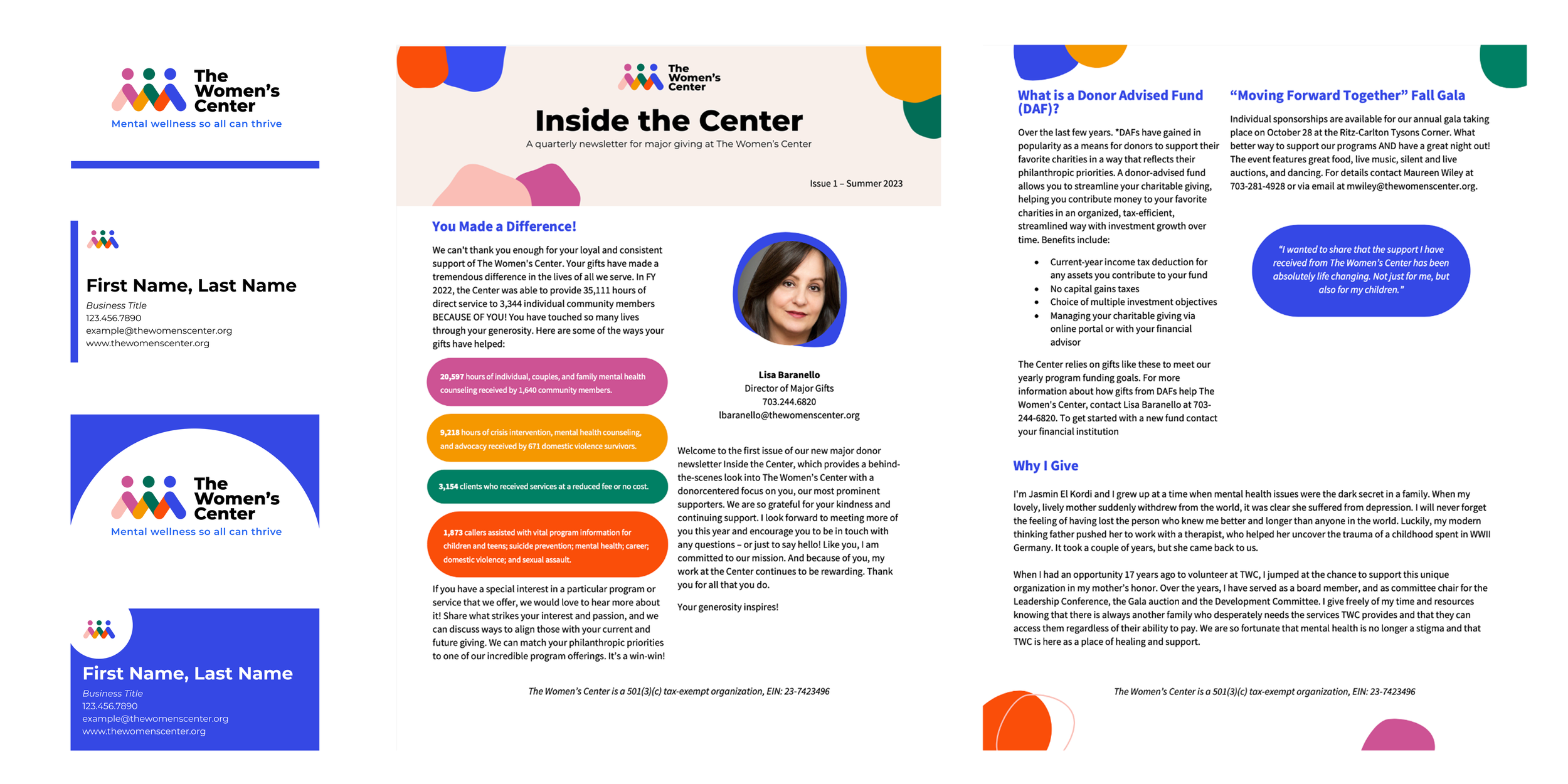 Accenture Song was asked by The Women's Center, a nonprofit organization located in Washington DC, to create a new visual identity for their 50-year anniversary. As a visual designer, my role included helping to create a comprehensive style guide, designing and creating visually interesting and engaging brand marketing materials such as business cards, newsletter templates, flyers, and website page mockups, all while maintaining brand consistency across brand designs.